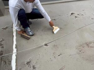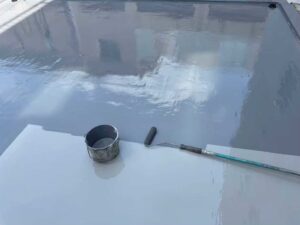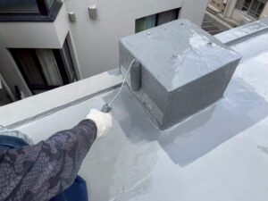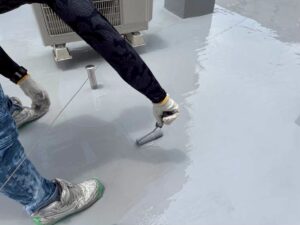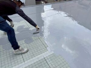 通気緩衝シートの上からウレタン防水材を塗布し、防水層を形成していきます。