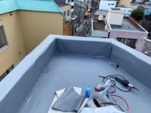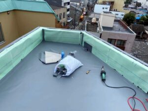 雨漏りが長く続いていたこともあり、今回は、耐久性・メンテナンス性を考慮した塩ビシート防水(機械固定式)による改修をご提案いたしました。