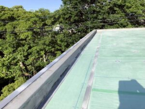 雨水の侵入リスクを抑えるため、笠木部分まで含めて屋上全体に塩ビシートを敷設しています。