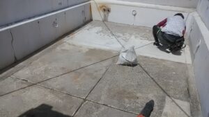 現地調査の結果、既存の屋上はシンダーコンクリート仕上げで、目地の劣化やひび割れが多数発生しており、そこから雨水が浸入している状態でした。