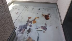 バルコニーの防水層は表面の剥がれや劣化が見られ、防水性能が低下している状態でした。