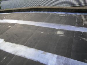 現地調査の結果、屋上(陸屋根)に施工されていた既存のゴムシート防水が経年劣化しており、シートの浮きや継ぎ目部分から雨水が侵入している状態でした。