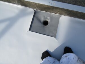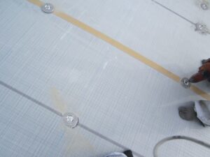 下地は雨漏りしてしまっているため、今回は新たに絶縁シートを敷設し、塩ビシート防水 〈機械固定工法〉を施工させて頂く運びとなりました。固定用のディスクや改修用ドレンを取り付け、シートを敷設します。