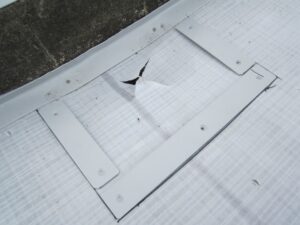 もともとはゴムシート防水が施されており、ゴムシート防水は耐用年数を超えると、接着力の低下やシートの硬化、ひび割れが起こりやすく、それが今回の雨漏り原因になっていました。