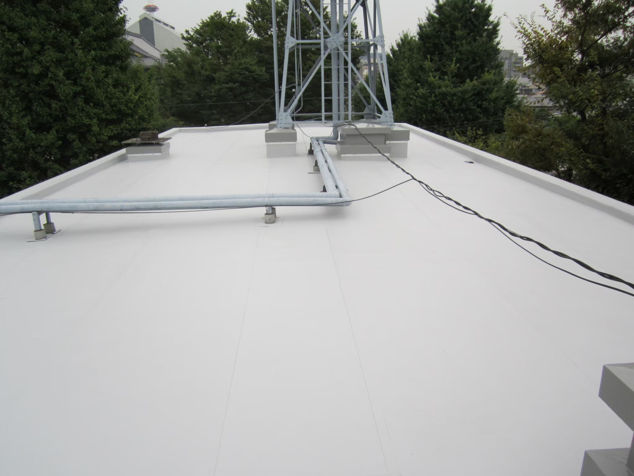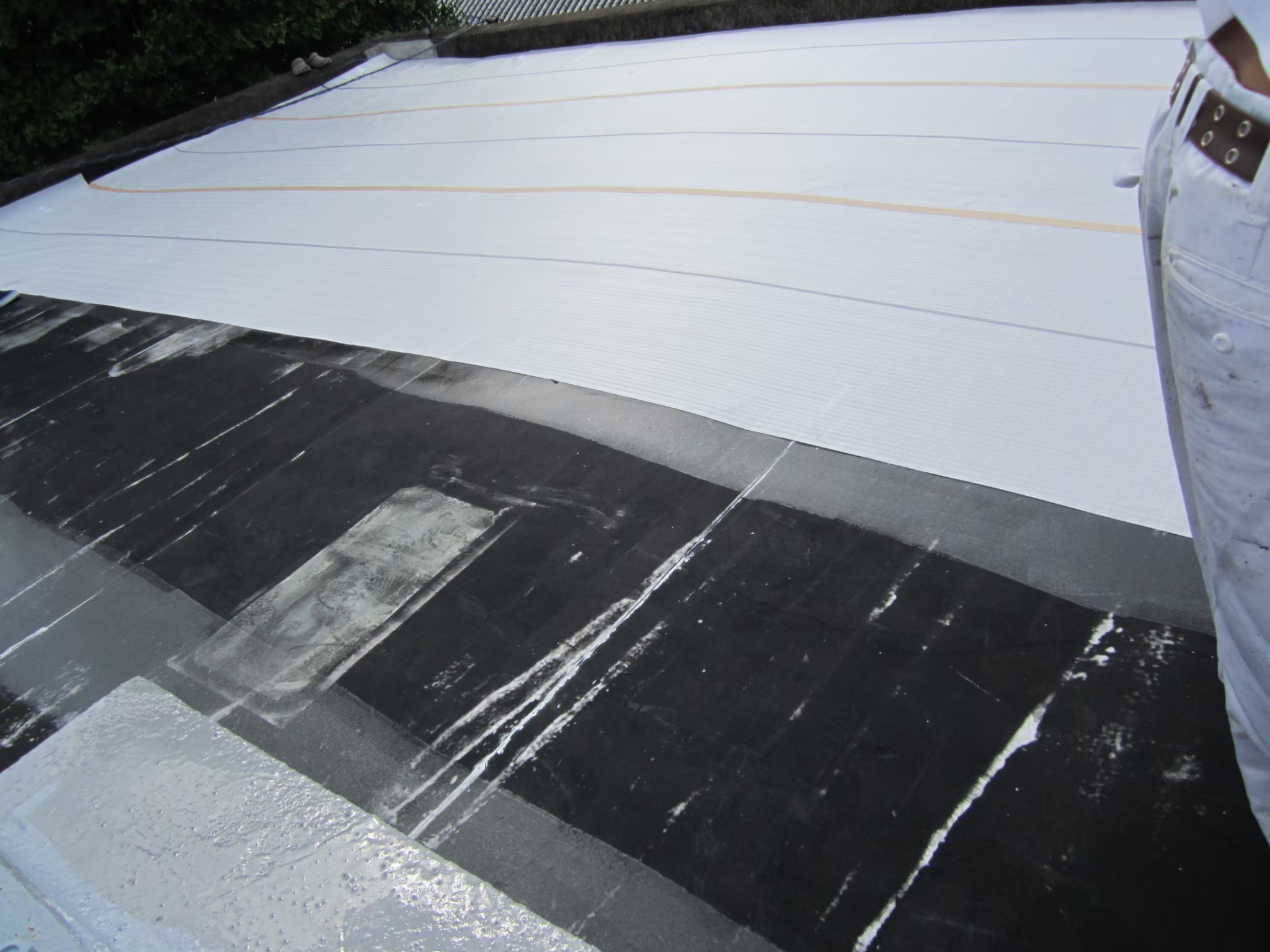 今回は既存防水の状態と今後のメンテナンス性を考慮し、塩ビシート防水(機械固定工法) による改修工事をご提案・施工しました。